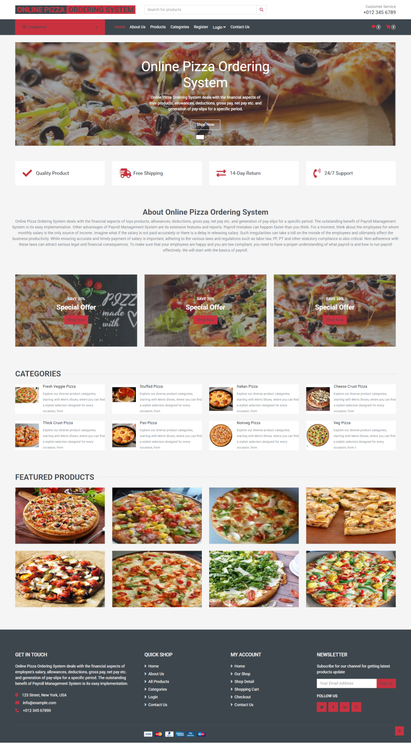 This Online Pizza Ordering System project has been developed using Python, Django, and MySQL. At Freeprojectz.com, we offer a variety of easy-to-develop Python projects suitable for final year college students. Students can download the best Python code projects based on their requirements. The primary goal of this Online Pizza Ordering System Project in Python is to manage all details related to Pizza Items, Pizza Items Types, Companies, Orders, Order Items, and more. The project features two types of users: Customers and Admins. Admin can add the new Pizza Items, category and types and customer can buy any Pizza Items. This major Python project have two view admin and customer who will manage the whole project. Students can download free Python MySQL academic projects complete with source code, database, and documentation.