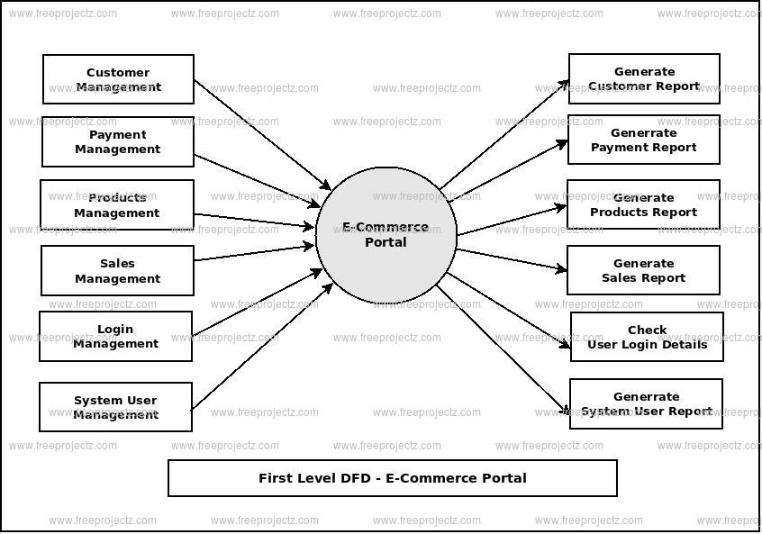 DFD Level 2 then goes one step deeper into parts of Level 1 of E-Commerce. It may require more functionalities of E-Commerce to reach the necessary level of detail about the E-Commerce functioning. First Level DFD (1st Level) of E-Commerce Portal shows how the system is divided into sub-systems (processes). The 2nd Level DFD contains more details of Shiping, Bill, Payment, Customer, Sales, Category, Product.Low level functionalities of E-Commerce Portal
