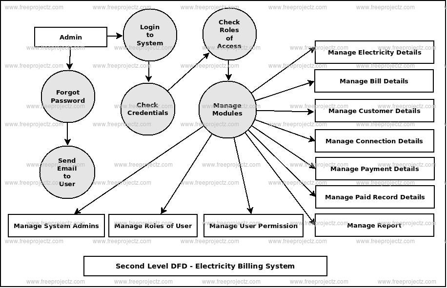 DFD Level 2 then goes one step deeper into parts of Level 1 of Electricity. It may require more functionalities of Electricity to reach the necessary level of detail about the Electricity functioning. First Level DFD (1st Level) of Electricity Billing System shows how the system is divided into sub-systems (processes). The 2nd Level DFD contains more details of Unpaid Record, Paid Record, Customer, Connections, Payment, Bills, Electric.Low level functionalities of Electricity Billing System