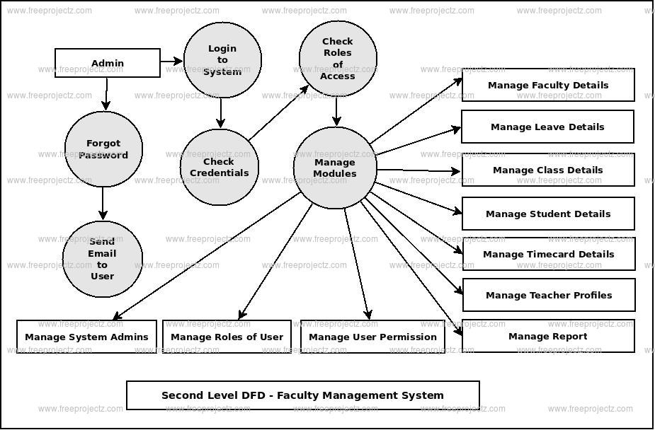 DFD Level 2 then goes one step deeper into parts of Level 1 of Faculty Management. It may require more functionalities of Faculty Management to reach the necessary level of detail about the Faculty Management functioning. First Level DFD (1st Level) of Faculty Management System shows how the system is divided into sub-systems (processes). The 2nd Level DFD contains more details of Subject, Course, Teacher, Timecard, Student, Faculty, Leave.Low level functionalities of Faculty Management System