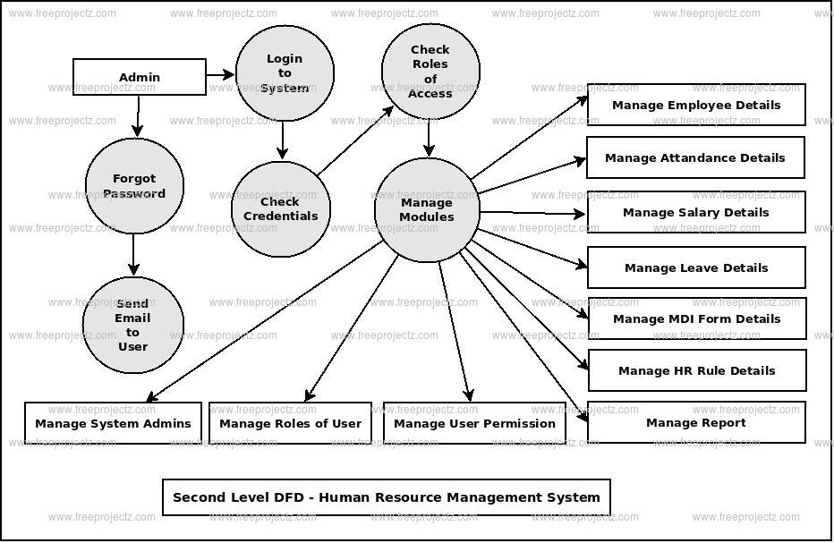 DFD Level 2 then goes one step deeper into parts of Level 1 of Human Resource. It may require more functionalities of Human Resource to reach the necessary level of detail about the Human Resource functioning. First Level DFD (1st Level) of Human Resource Management System shows how the system is divided into sub-systems (processes). The 2nd Level DFD contains more details of HR Rule, Attendance, Leave Type, Leave, Salary, Employee, MDI Form.