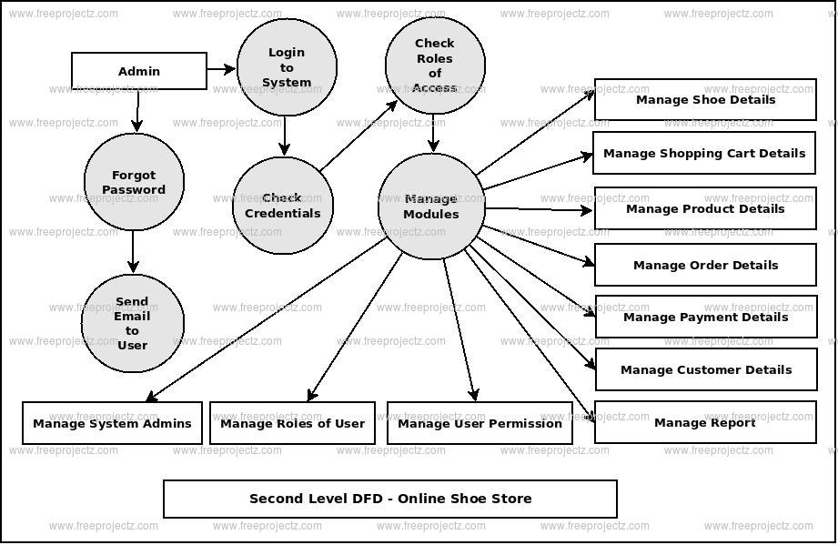 DFD Level 2 then goes one step deeper into parts of Level 1 of Shoe Store. It may require more functionalities of Shoe Store to reach the necessary level of detail about the Shoe Store functioning. First Level DFD (1st Level) of Online Shoe Store shows how the system is divided into sub-systems (processes). The 2nd Level DFD contains more details of Customer, Payment, Shipment, Product, Order, Shopping Cart, Shoe.Low level functionalities of Online Shoe Store