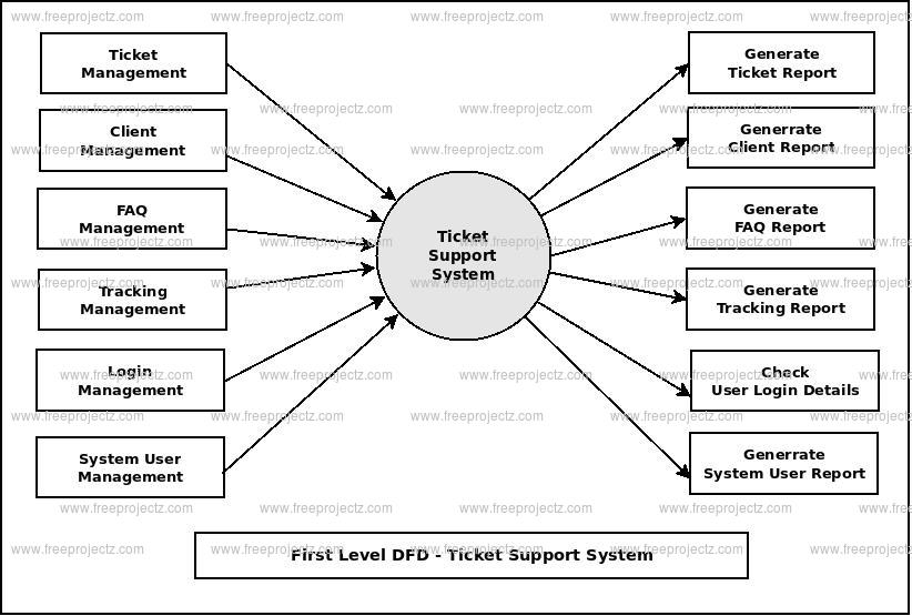 DFD Level 2 then goes one step deeper into parts of Level 1 of Ticket Support. It may require more functionalities of Ticket Support to reach the necessary level of detail about the Ticket Support functioning. First Level DFD (1st Level) of Ticket Support System shows how the system is divided into sub-systems (processes). The 2nd Level DFD contains more details of Ticket Type, Tracker, Issue, Client, Help Desk, Support, Ticket.Low level functionalities of Ticket Support System