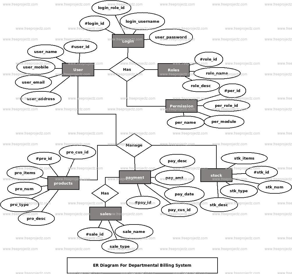 This ER (Entity Relationship) Diagram represents the model of Departmental Billing System Entity. The entity-relationship diagram of Departmental Billing System shows all the visual instrument of database tables and the relations between Stock, Products, Discounts, Payments etc. It used structure data and to define the relationships between structured data groups of Departmental Billing System functionalities. The main entities of the Departmental Billing System are Discounts, Stock, Inventory, Products, Sales and Payments.