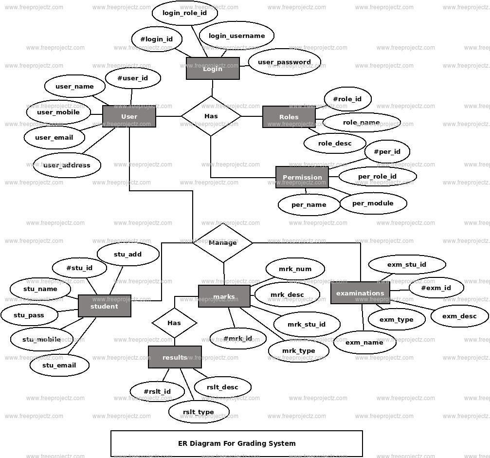 - Marks Entity : Attributes of Marks are mark_id, mark_student_id, mark_exam_id, mark_result, mark_number, mark_type, mark_description