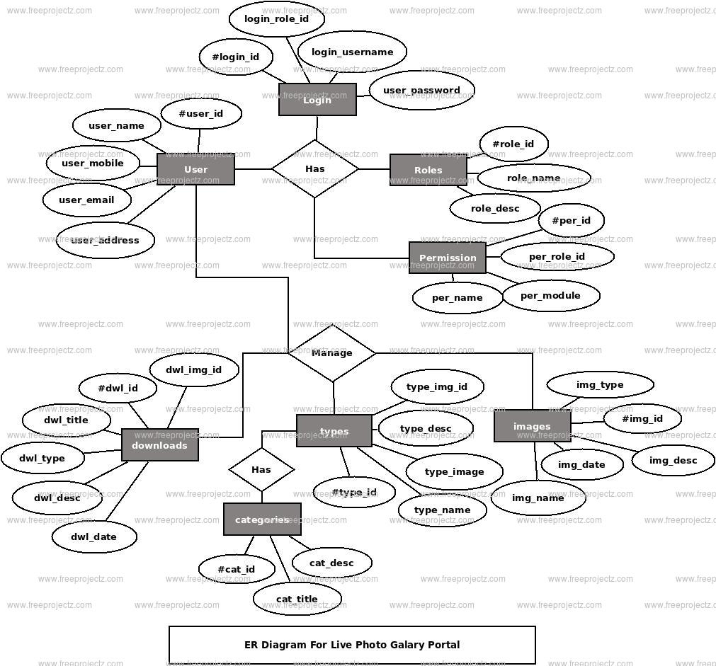 This ER (Entity Relationship) Diagram represents the model of Live Photo Galary Portal Entity. The entity-relationship diagram of Live Photo Galary Portal shows all the visual instrument of database tables and the relations between Types, Categories, Images, Uploads etc. It used structure data and to define the relationships between structured data groups of Live Photo Galary Portal functionalities. The main entities of the Live Photo Galary Portal are Images, Types, Downloads, Categories, Login and Uploads.