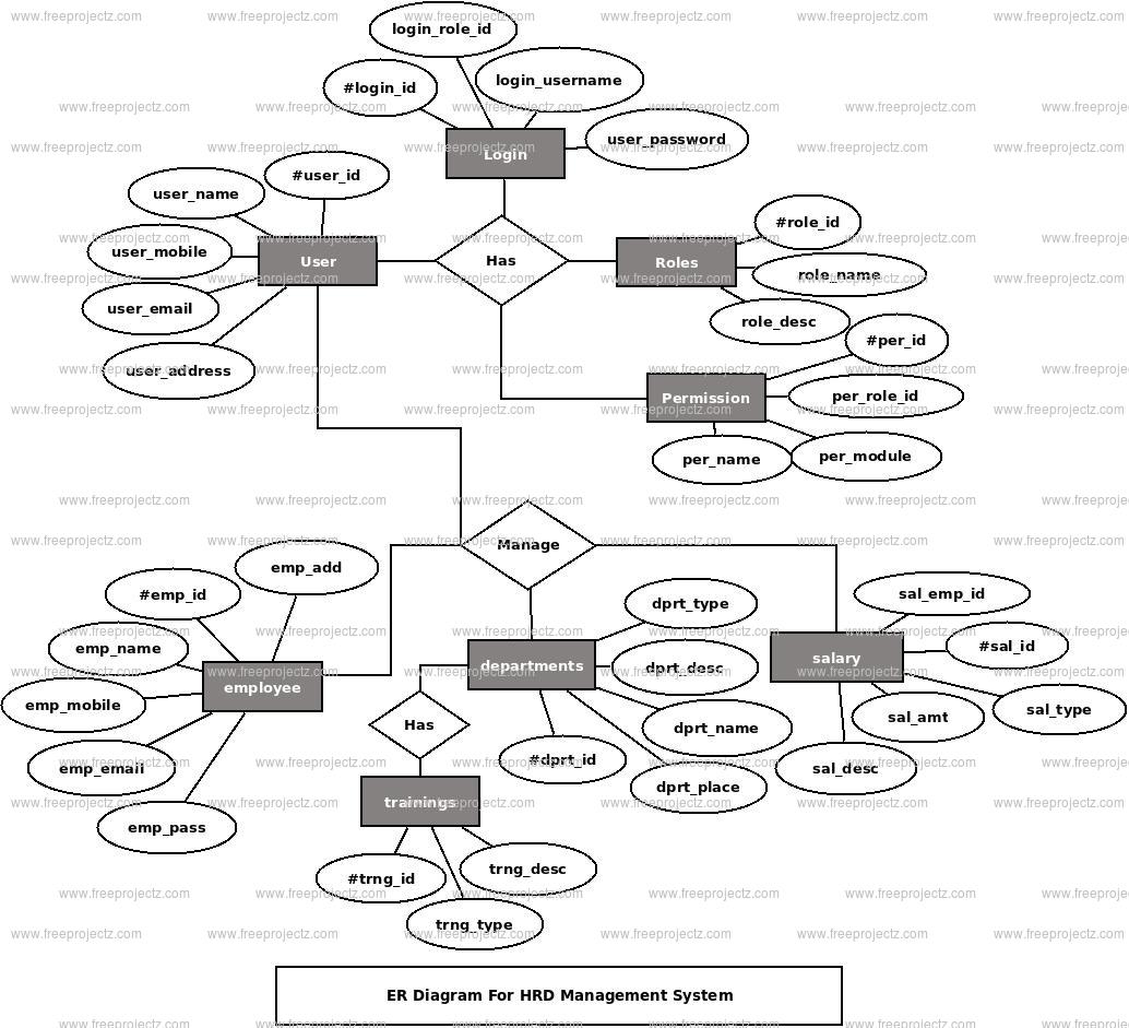 This ER (Entity Relationship) Diagram represents the model of HRD Management System Entity. The entity-relationship diagram of HRD Management System shows all the visual instrument of database tables and the relations between Trainings, Departments, Employee, Salary slip etc. It used structure data and to define the relationships between structured data groups of HRD Management System functionalities. The main entities of the HRD Management System are Employee, Trainings, Appraisals, Departments, Salary and Salary slip.