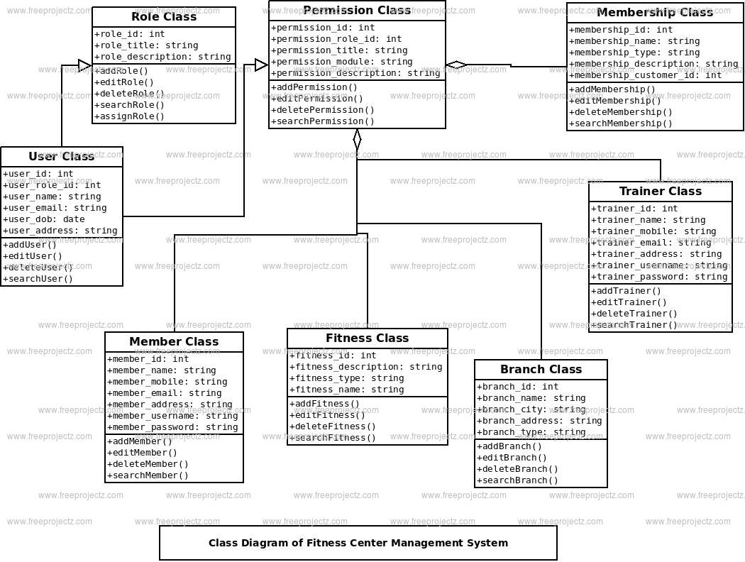Classes and their methods of Fitness Center Management System Class Diagram: