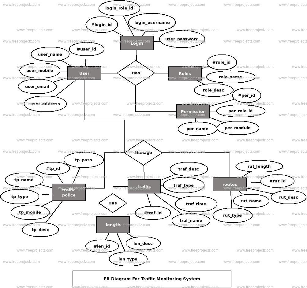 - Traffic Entity : Attributes of Traffic are traffic_id, traffic_name, traffic_type, traffic_description