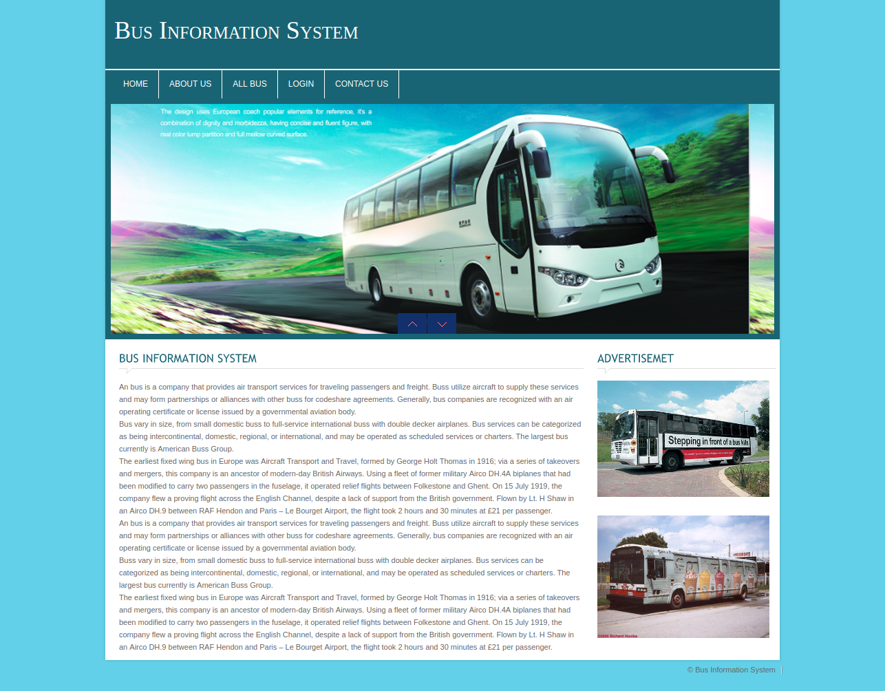 This mini project Bus Information System has been developed using PHP and MySQL. The primary goal of this mini PHP project is to provide comprehensive information related to buses. This project features a single admin user who can manage all bus-related information. After logging in, the admin can edit, delete, and update bus details such as name, bus company, route, arrival timing, city, and more. Students can view all bus-related information and listings. Computer Science students can download PHP projects with databases for free, including source code.