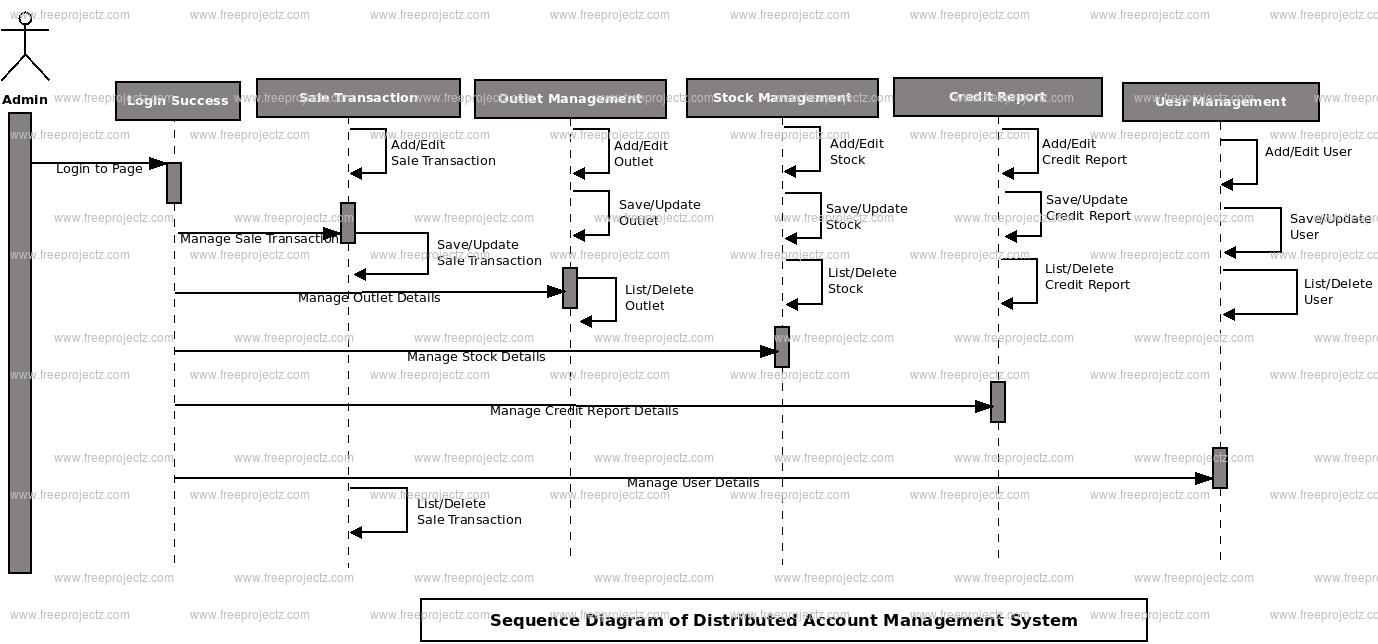 This is the UML sequence diagram of Distributed Account Management System which shows the interaction between the objects of Stock Update, User, Sale Transaction, Outlet, Day to Day Transaction. The instance of class objects involved in this UML Sequence Diagram of Distributed Account Management System are as follows: