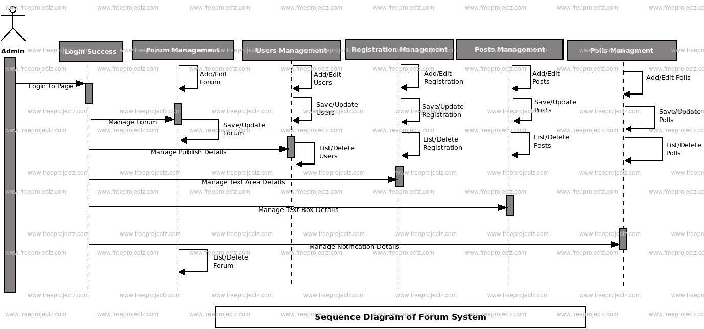 This is the Login Sequence Diagram of Forum System, where admin will be able to login in their account using their credentials. After login user can manage all the operations on Forum, Users, Polls, Posts, Registartions. All the pages such as Polls, Posts, Registartions are secure and user can access these page after login. The diagram below helps demonstrate how the login page works in a Forum System. The various objects in the Posts, Forum, Users, Polls, and Registartions page—interact over the course of the sequence, and user will not be able to access this page without verifying their identity.