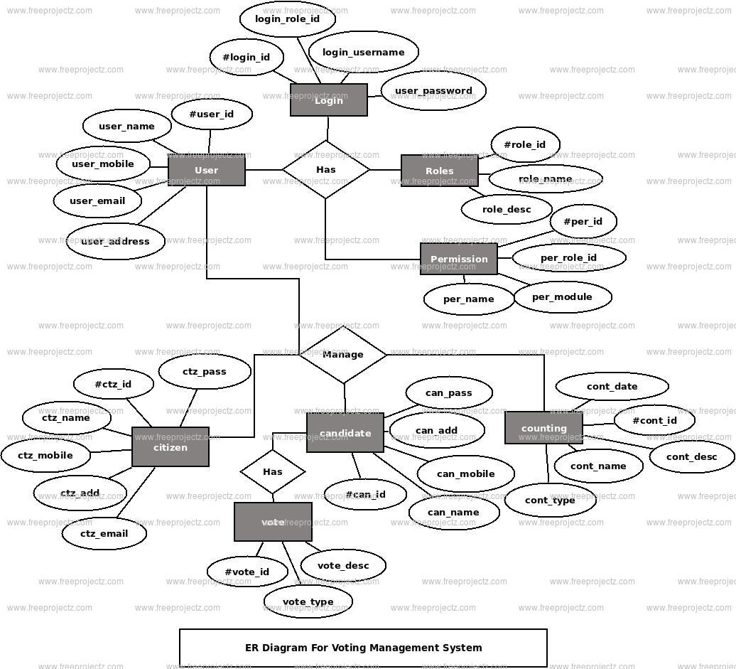 - Vote Entity : Attributes of Vote are vote_id, vote_name, vote_type, vote_description