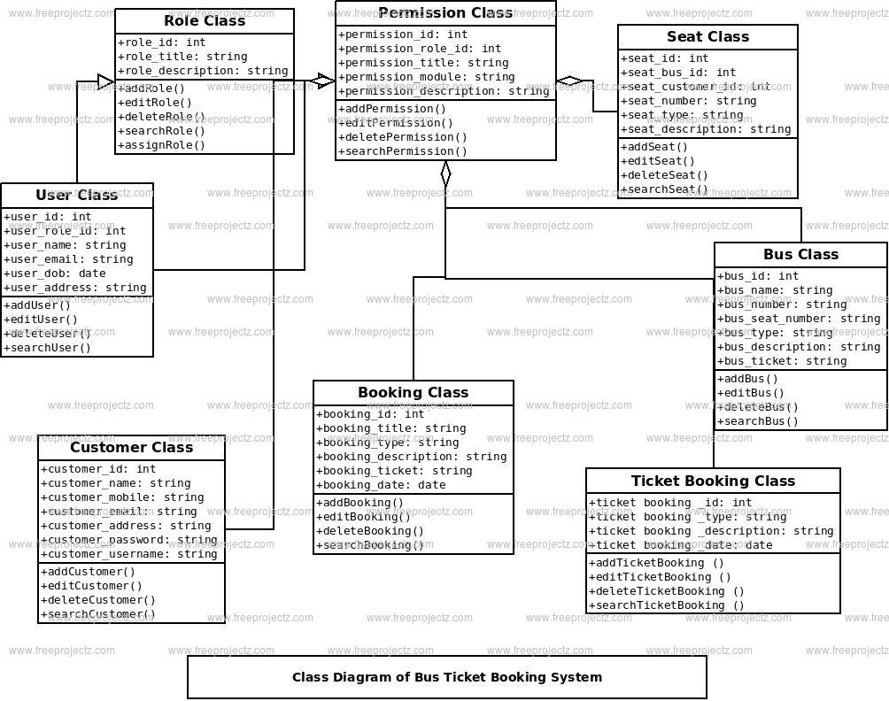 Classes and their methods of Bus Ticket Booking System Class Diagram: