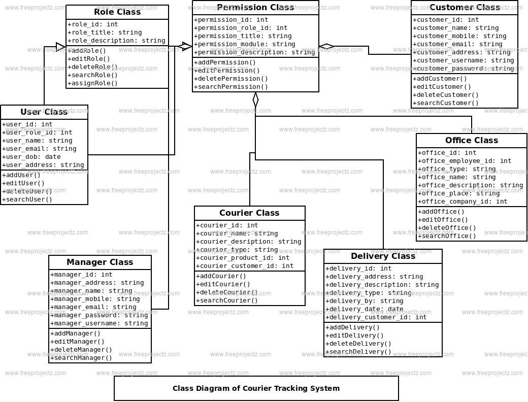 Classes and their attributes of Courier Tracking System Class Diagram: