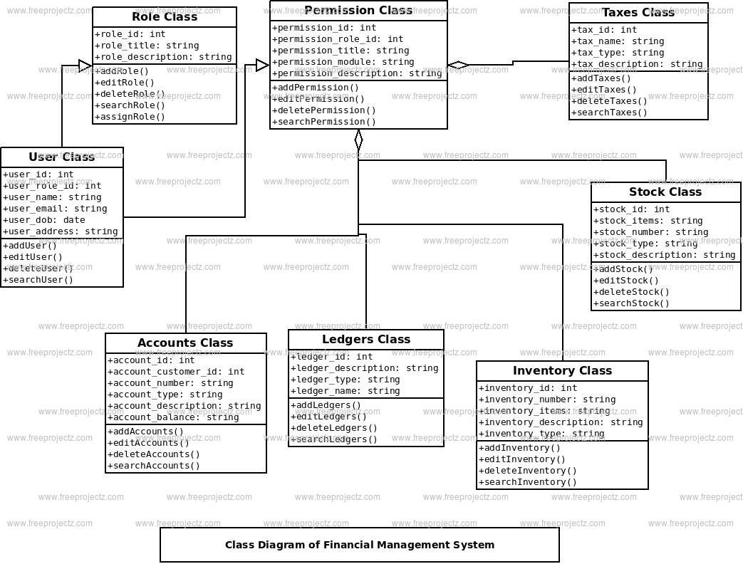 Classes and their methods of Financial Management System Class Diagram: