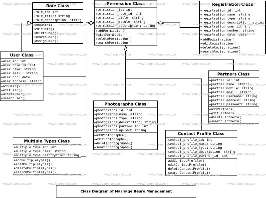 Marrige Buero Management Class Diagram describes the structure of a Marrige Buero Management classes, their attributes, operations (or methods), and the relationships among objects. The main classes of the Marrige Buero Management are Partners, Registration, Contact Profile, Photograps, Documents Support, Multipile Types.
