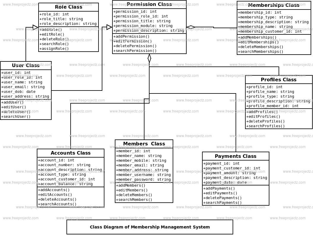 Classes and their methods of Membership Management System Class Diagram: