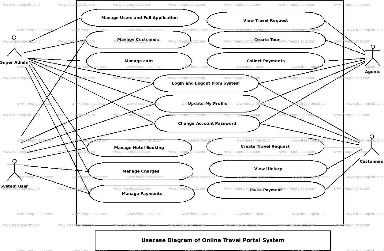 - Super Admin Entity : Use cases of Super Admin are Manage Users, Manage Registrations Customer, Manage Cabs, Manage Bookings, Manage Charges, Manage Payments, Manage Hotel Booking, Manage Users and Full Online Travel Portal System Operations