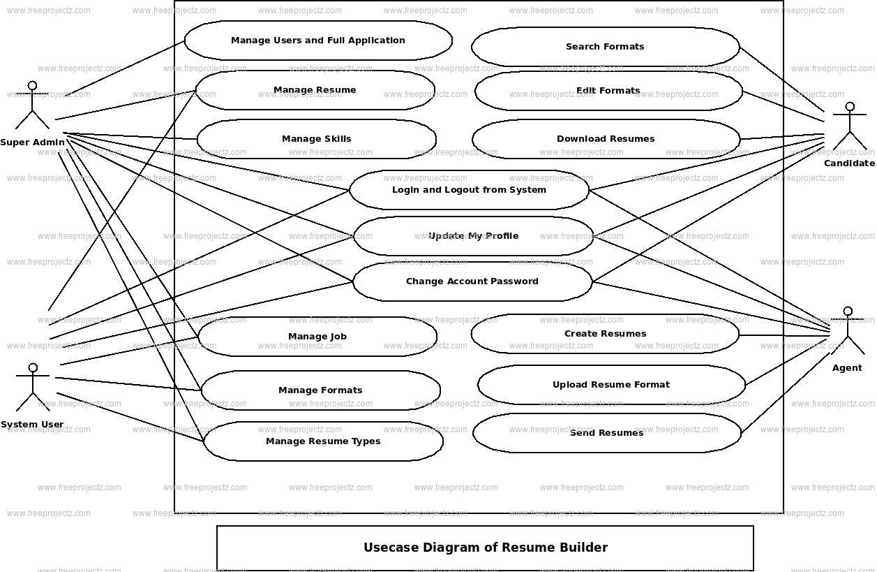 This Use Case Diagram is a graphic depiction of the interactions among the elements of Resume Builder. It represents the methodology used in system analysis to identify, clarify, and organize system requirements of Resume Builder. The main actors of Resume Builder in this Use Case Diagram are: Super Admin, System User, Agent, Candidate, who perform the different type of use cases such as Manage Resume, Manage Skills, Manage Job, Manage Formats, Manage Resume Types, Manage Users and Full Resume Builder Operations. Major elements of the UML use case diagram of Resume Builder are shown on the picture below.