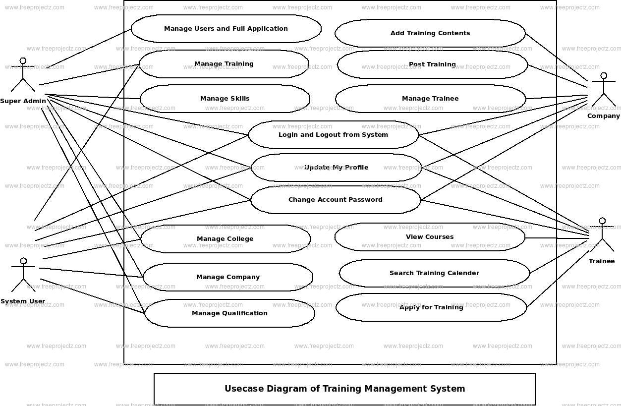 - Super Admin Entity : Use cases of Super Admin are Training, Manage Skills, Manage College, Manage Comapny, Manage Job, Manage Knowledge, Manage Qualification, Manage Users and Full Training Management System Operations